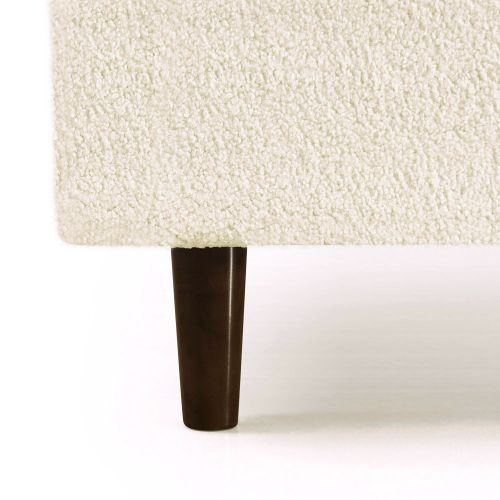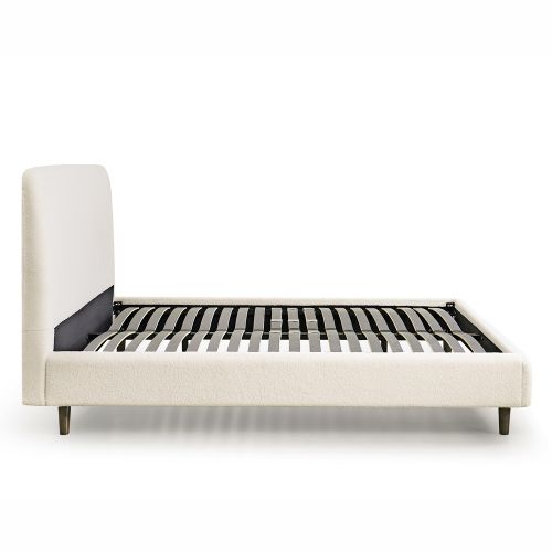 Le lit est confectionné avec un tissu d’ameublement en bouclette écru très dense d'une qualité exceptionnelle. La tête de lit est galbée pour un confort optimum et les coins du lit sont arrondis pour une finition plus harmonieuse.